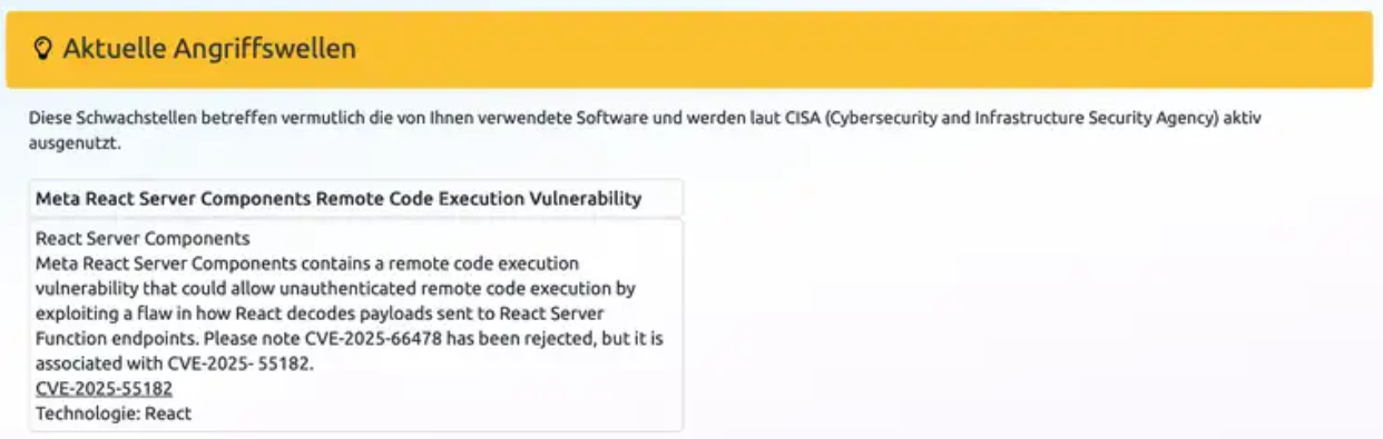 Die Lösung macht auf einen Blick sichtbar, welche Angriffswellen aktuell real stattfinden, welche Produkte betroffen sind und ob ein unmittelbares Risiko für bestehende Systeme besteht.
